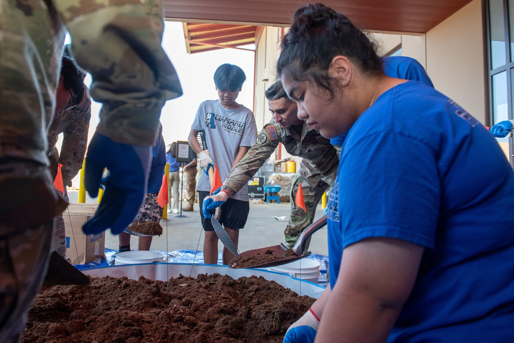 Students from the Aliamanu Middle School dig and fill buckets with dirt to simulate a recovery mission during their visit to the Defense POW/MIA Accounting Agency facilities on Joint Base Pearl Harbor-Hickam, Hawaii, Feb. 13, 2025. The agency participated in its third Student Summit Career Day to engage with the local community and educate students on identification and recovery operations. Forensic anthropologists, underwater and terrestrial archaeologists and isotope preparation scientists led students through simulated hands-on techniques and briefs to share more about how the agency conducts recovery missions. (U.S. Marine Corps photo by Sgt. Lesley Cisneros)