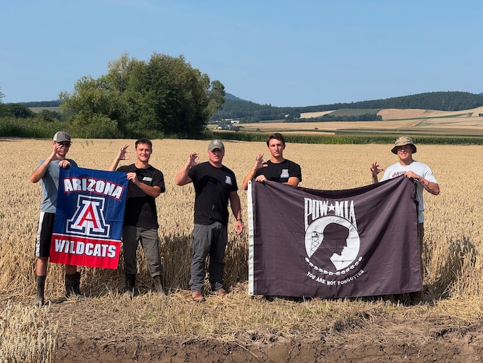 From left to right, Max von Husen, Zachariah Ellwanger, Lt. Col. Rich Ingleby, Carson Criswell, and Jonathan Ellwanger from the University of Arizona pose with their university flag, and the POW/MIA flag in Poland, Aug. 9, 2025. The cadets were able to experience a unique opportunity to work alongside trained DPAA personnel in the efforts to recover unaccounted U.S. personnel. (Courtesy Photo)
