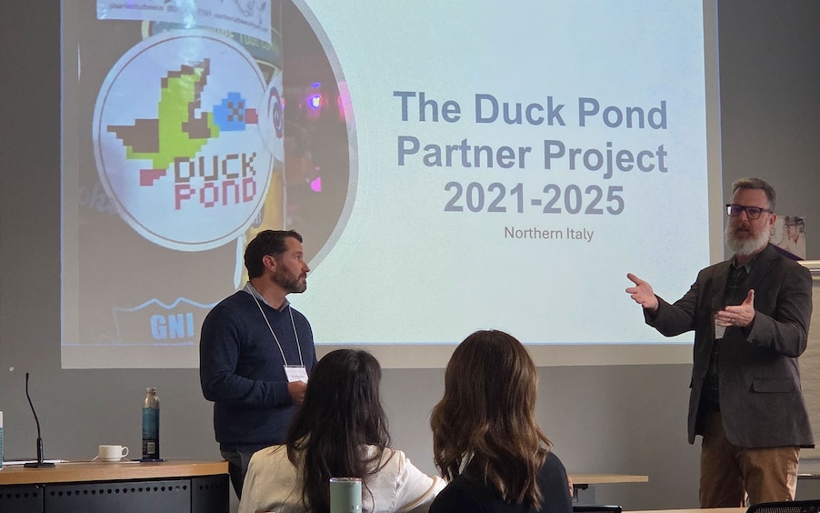 Kevin Dalton, Archaeologist and Terrestrial Development Lead with the Henry M. Jackson Foundation for the Advancement of Military Medicine in support of the Defense POW/MIA Accounting Agency, left, and Bryan Harrell, a member of SEARCH, a DPAA partner organization, discuss the Duck Pond mission during DPAA’s fourth annual Partnership Symposium at Cranfield University, Sept. 24, 2025. The event advanced international collaboration in the effort to account for U.S. personnel still missing from past conflicts and brought together more than 35 partners who support the accounting mission by assisting DPAA with field archaeology, research, and innovation. (Courtesy photo)