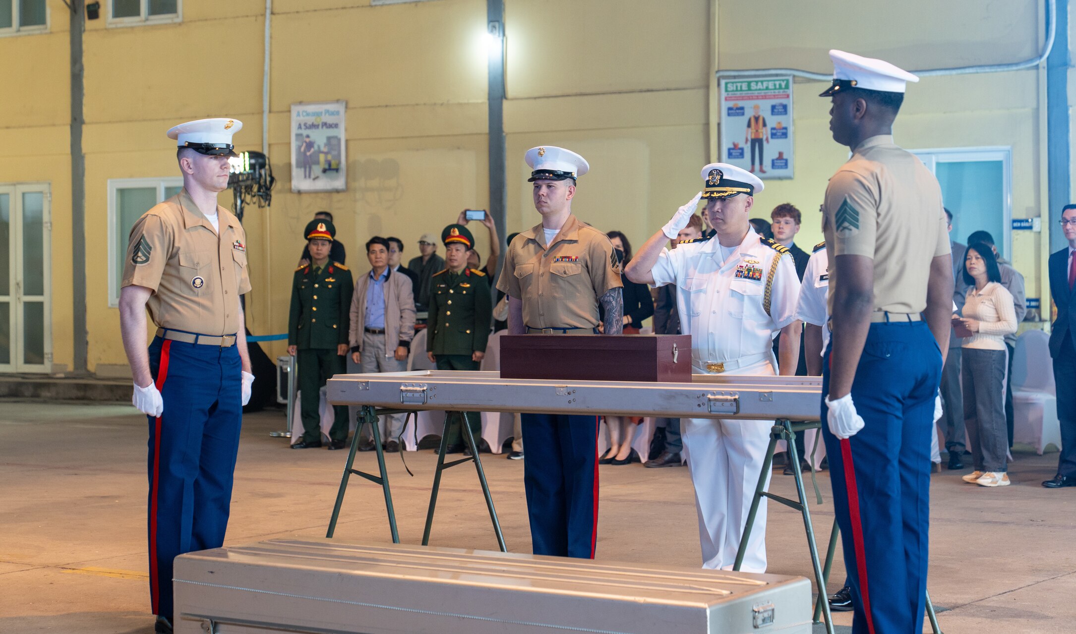 A U.S. Navy commander renders a salute during the 171st Repatriation Ceremony at the Gia Lam Airfield, Hanoi, Vietnam, on Dec. 13, 2025. DPAA received possible remains of a U.S. service member from the Vietnam War thought to be associated with a U.S. Air Force F-105 crash site in Yen Bai Province. The remains were presented by the Vietnam Office for Seeking Missing Persons during the Ceremony. DPAA will transport the potential remains to the Daniel K. Inouye DPAA Center of Excellence in Honolulu for further analysis. (Courtesy Photo)