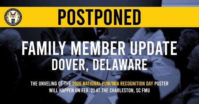Dover Family Member Update has been postponed. The National POW/MIA Recognition Day poster unveiling will be held on February 21, 2026 at the Charleston, SC Family Member Update.