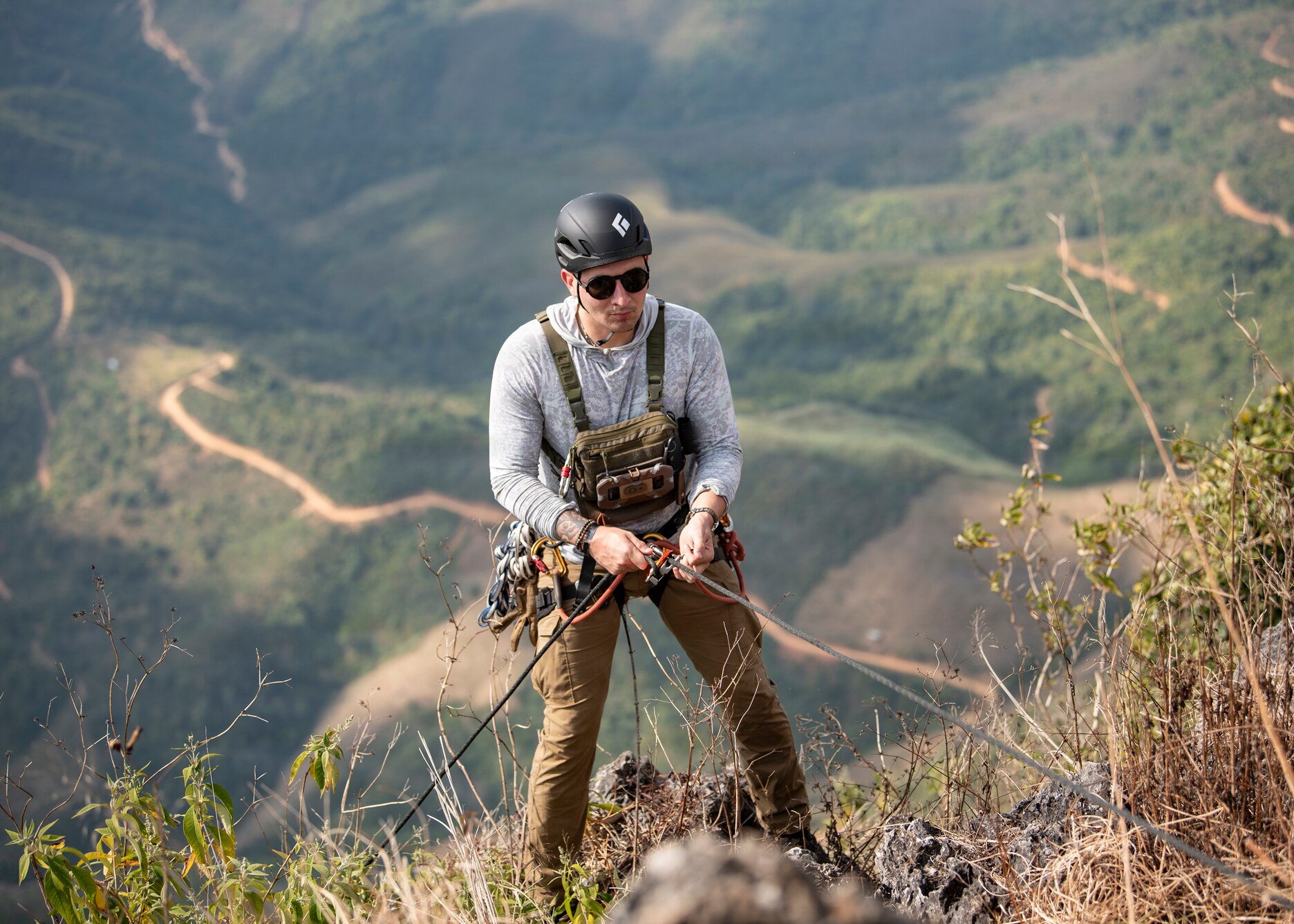 U.S. Army Staff Sgt. Brandon Valverde, Defense POW/MIA Accounting Agency mountaineer, rappels a cliff face during a recovery mission in Laos, Jan. 21, 2026. Some missions require mountaineers to serve as team members to ensure the safety of everyone involved while operating in mountainous terrain. There are more than 280 personnel missing in Laos from the Vietnam War. (U.S. Air Force photo by Staff Sgt. Dallin Wrye)