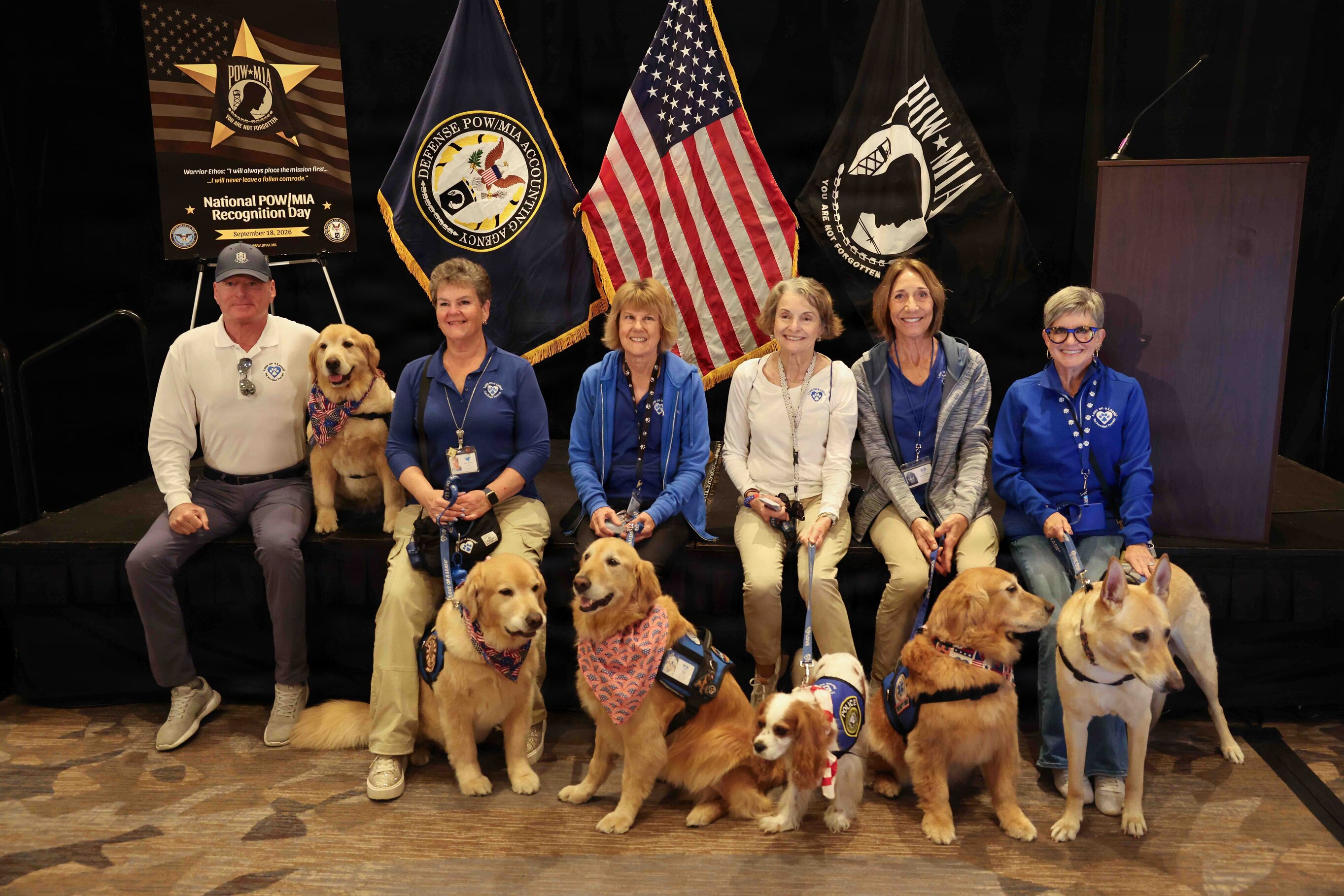 Members of Love on a Leash, a therapy dog organization that provides certified therapy dogs for veterans and others in need, pose for a photo during the Defense POW/MIA Accounting Agency Family Member Update in San Diego, Ca. , March 28, 2026. The event gives families the opportunity to hear from DPAA leadership and subject matter experts through detailed briefings on recovery missions, laboratory identification processes, and the latest case developments. It also allows families to engage directly with DPAA personnel, ask questions, and gain a deeper understanding of the ongoing efforts to account for their loved ones. (U.S. Army photo by Staff Sgt. Keion Jackson)