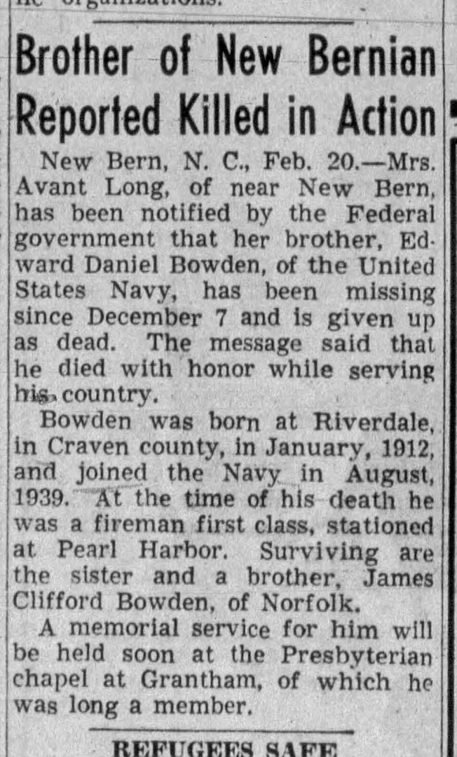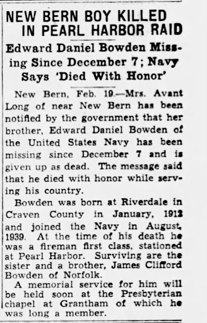 The Defense POW/MIA Accounting Agency announced today that U.S. Navy Fireman 1st Class Edward D. Bowden, 29, of New Bern, North Carolina, killed during World War II, was accounted for on April 1, 2025.