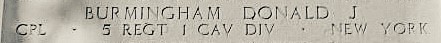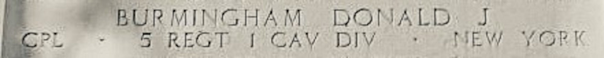 In September 1950, Burmingham was assigned to Company F, 2nd Battalion, 5th Cavalry Regiment, 1st Cavalry Division. He was reported missing in action on Sept. 6, in the vicinity of Waegwan, South Korea, near the Naktong River. Lacking evidence and eyewitness reports of his survival, the Army issued a presumptive finding of death for Burmingham on Dec. 31, 1953.