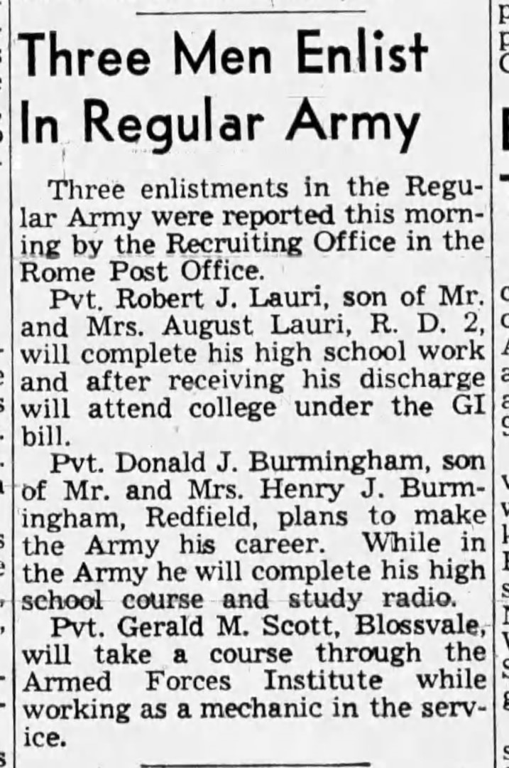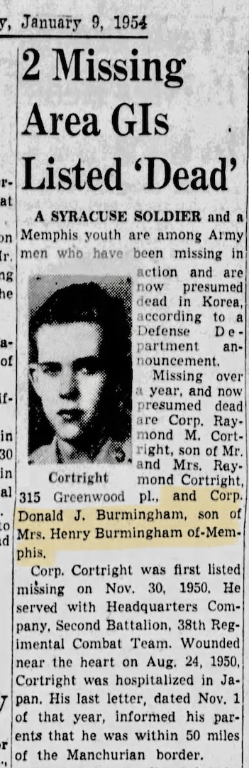 The Defense POW/MIA Accounting Agency announced today that U.S. Army Cpl. Donald J. Burmingham, 22, of Redfield, New York, killed during the Korean War, was accounted for July 17, 2025.
