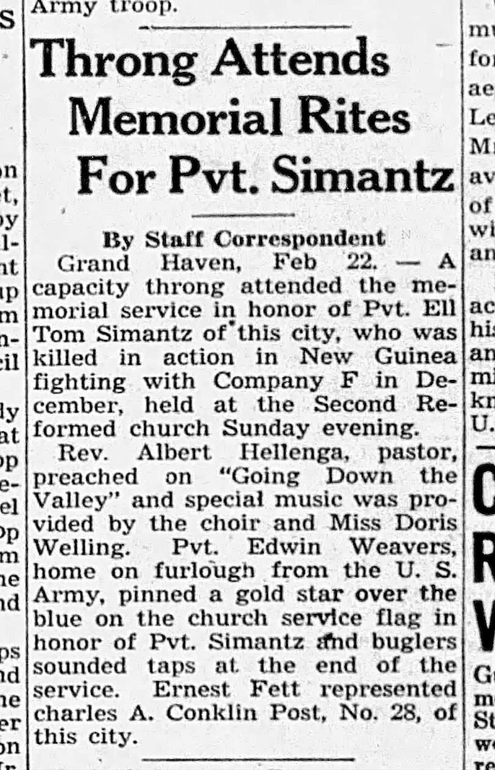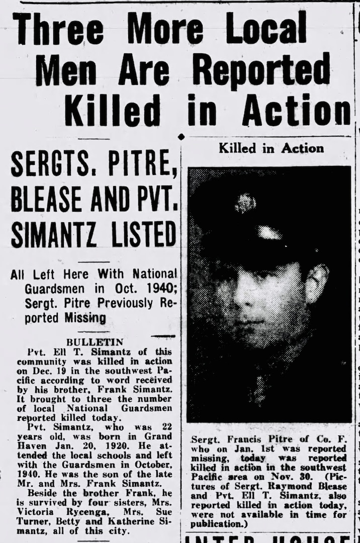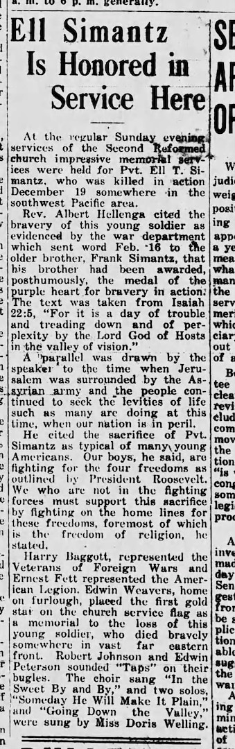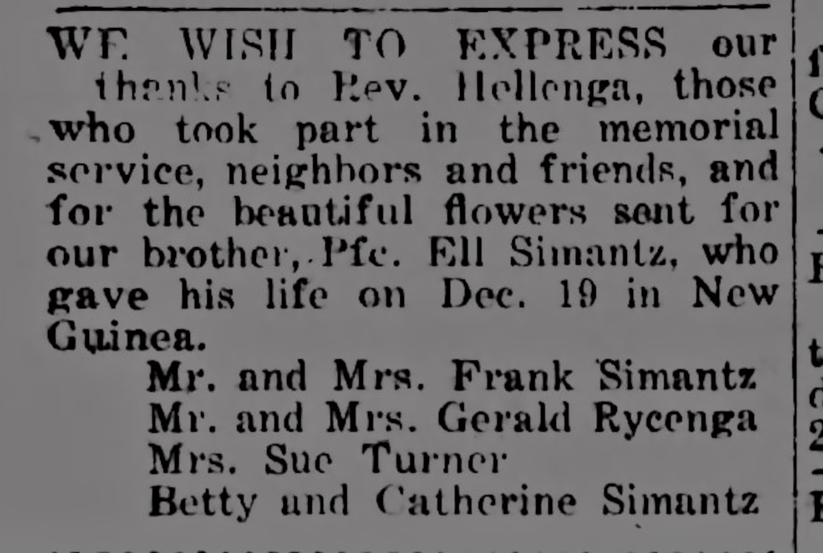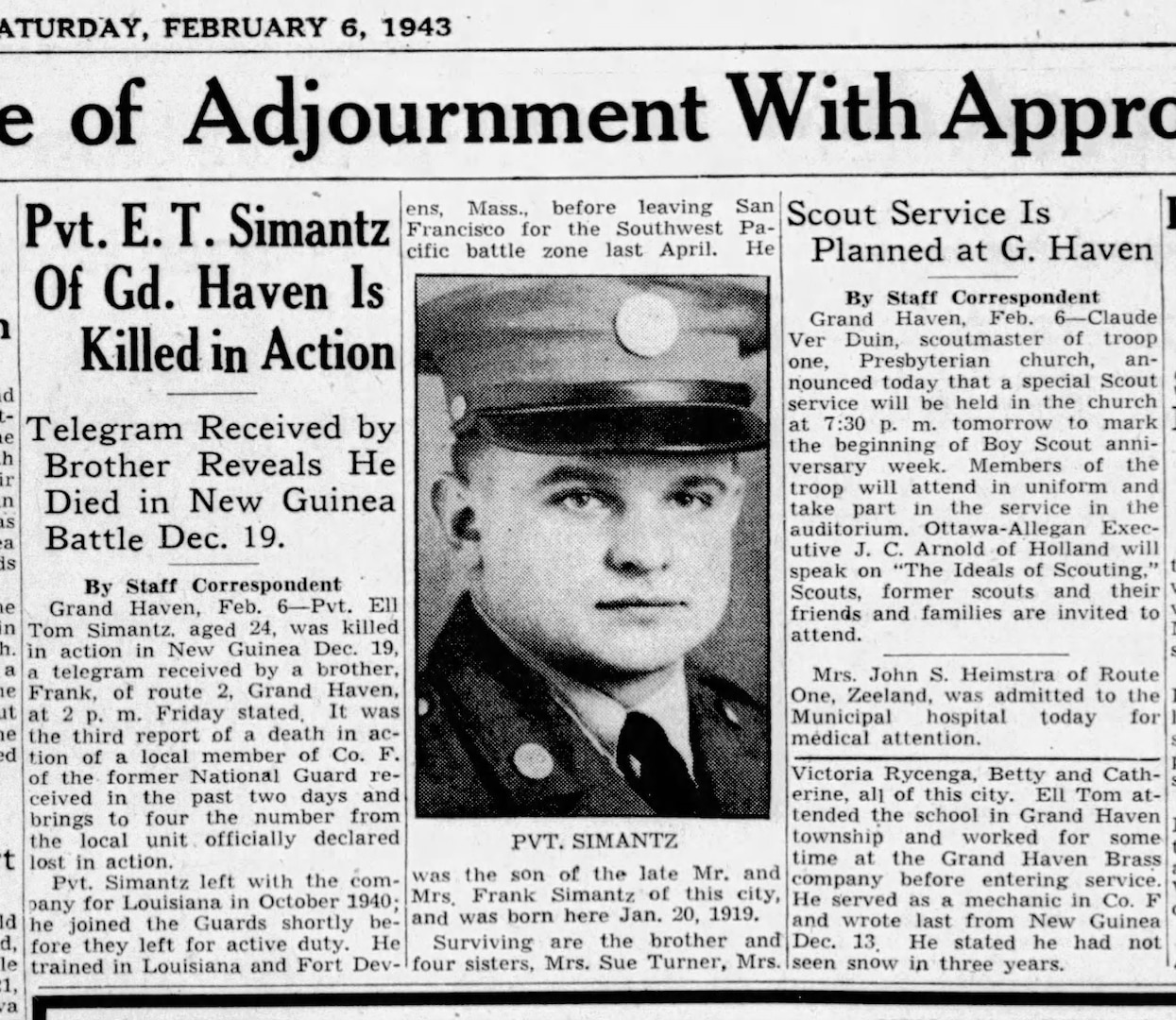 In late 1942, Simantz was assigned to Service Company, 126th Infantry Regiment, 32d Infantry Division, and deployed in present day Papua New Guinea. He was reportedly killed in action on Dec. 19 during an Allied campaign against fortified enemy positions in Papua New Guinea. His remains were not recovered after the war.