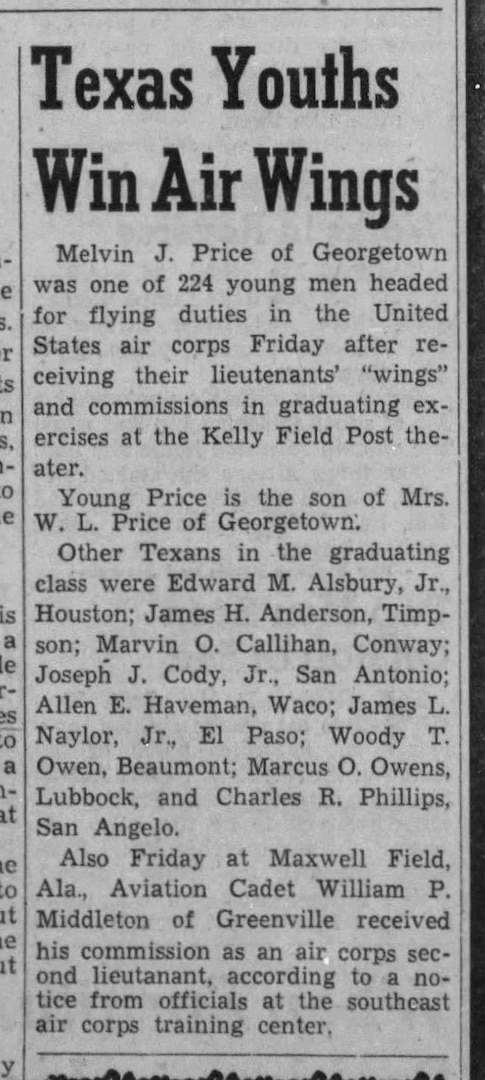 The Defense POW/MIA Accounting Agency announced today that U.S. Army Air Forces 1st Lt. Woody T. Owen, 25, of Beaumont, Texas, killed during World War II, was accounted for June 30, 2025.