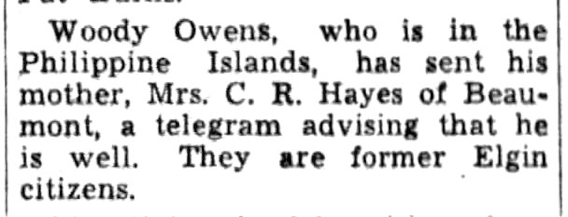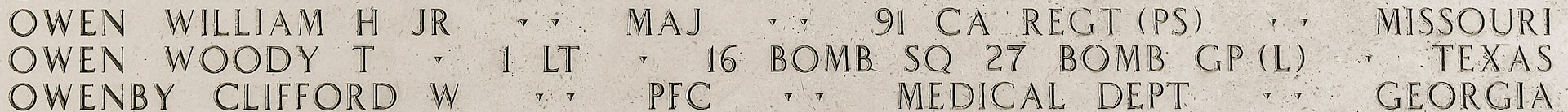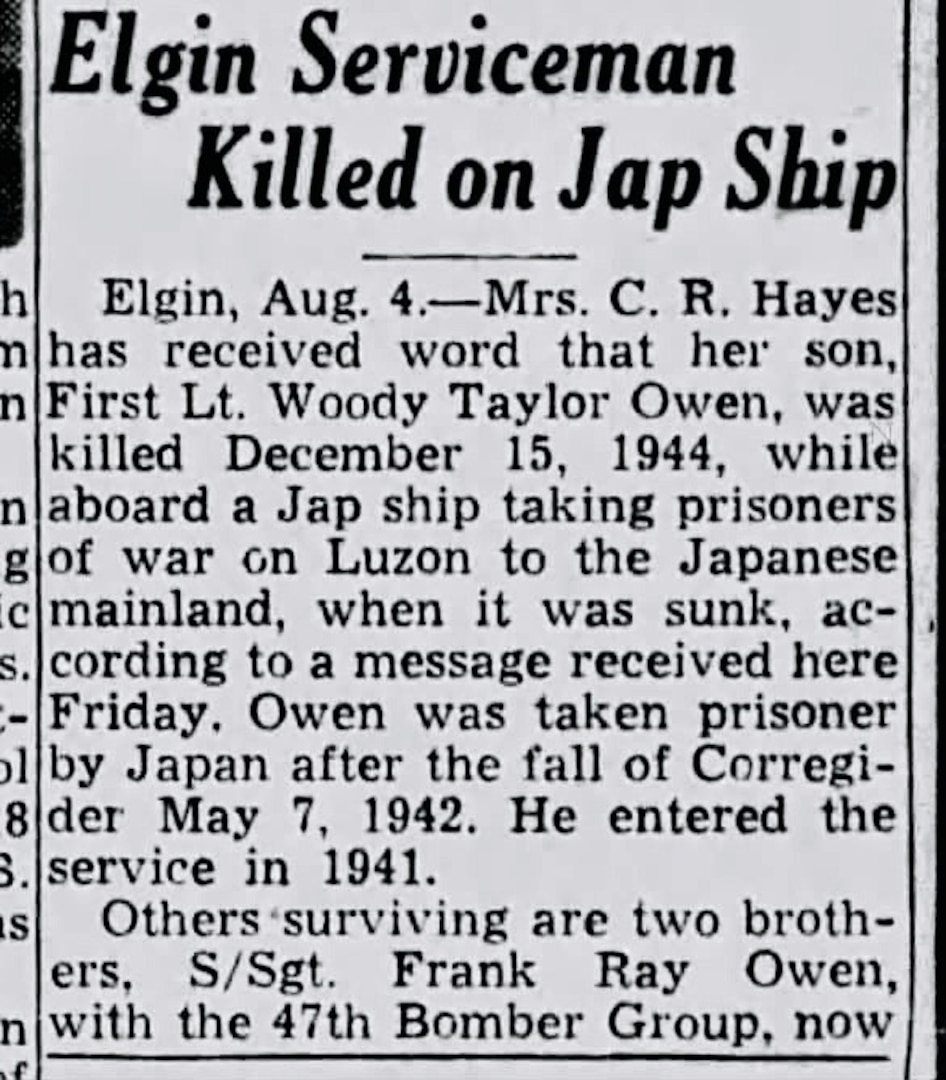 In 1942, Owen was assigned to 16th Bombardment Squadron, 27th Bombardment Group on the Bataan Peninsula, in the Philippines. He was captured on April 9 and held as a prisoner of war by the Empire of Japan in the Philippines until 1944 when the Japanese military moved POWs to Manila for transport to Japan aboard the transport ship Oryoku Maru. Unaware the allied POWs were on board, a U.S. carrier-borne aircraft attacked the Oryoku Maru, which eventually sank in Subic Bay. Owen was then transported to Takao, Formosa, known today as Taiwan, aboard the Enoura Maru. The Japanese reported that Owen died on Jan. 9, 1945, when U.S. forces attacked and sank the Enoura Maru.