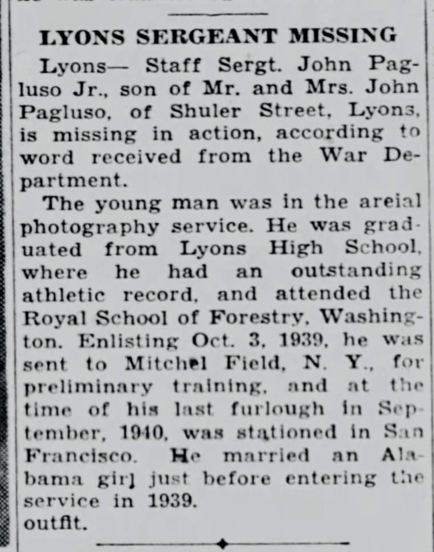 The Defense POW/MIA Accounting Agency announced today that U.S. Army Air Forces Staff Sgt. John A. Pagliuso, 24, of Lyons, New York, killed during World War II, was accounted for on March 17, 2025.
