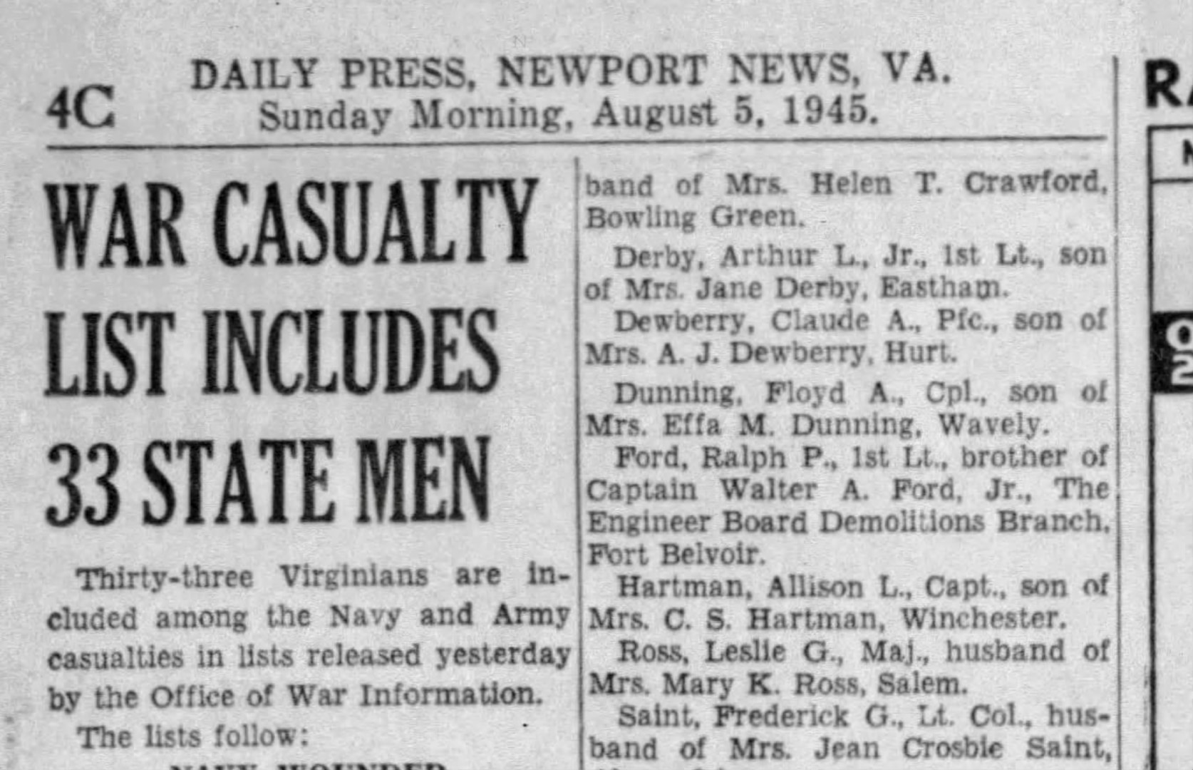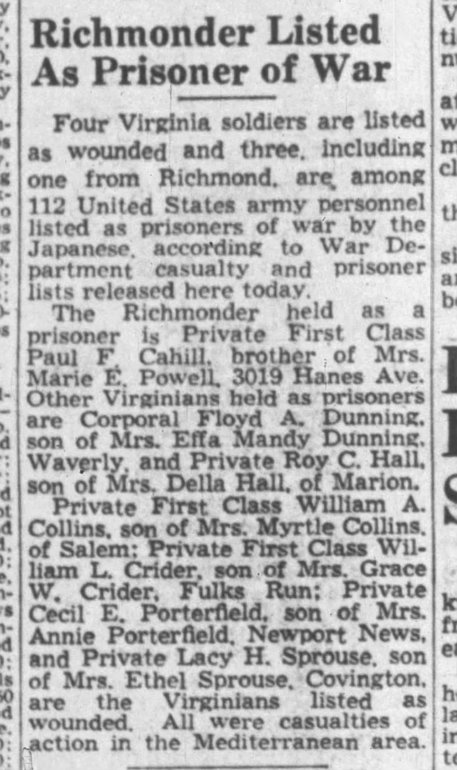 The Defense POW/MIA Accounting Agency announced today that U.S. Army Cpl. Floyd A. Dunning, 32, of Waverly, Virginia, killed during World War II, was accounted for Feb. 18, 2025.