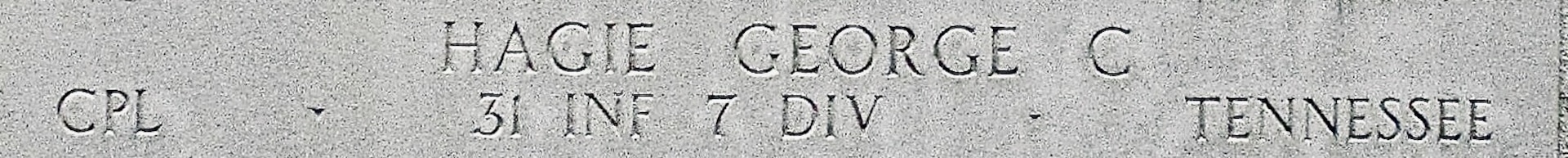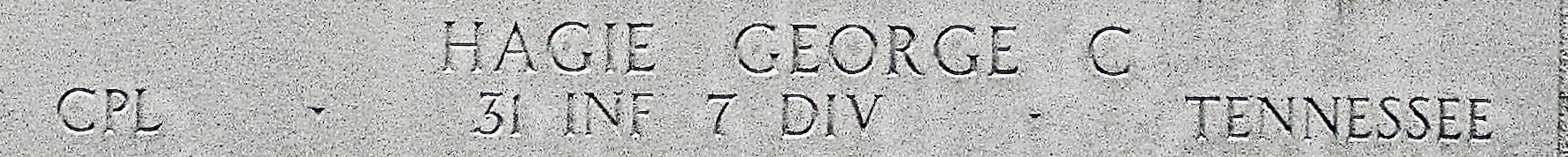 In the winter of 1950, Hagie was a member of Company K, 3rd Battalion, 31st Infantry Regiment, 7th Infantry Division. He was reported killed in action on Dec. 12 after a major battle near the Jangjin (Chosin) Reservoir, Democratic People's Republic of Korea (North Korea). Lacking any evidence that he was held a prisoner of war, Hagie was declared killed in action on Nov. 28, 1950.