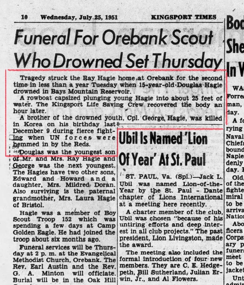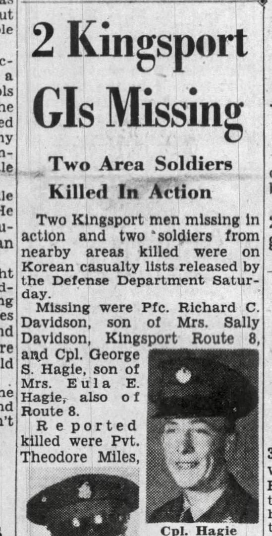 The Defense POW/MIA Accounting Agency announced today that U.S. Army Cpl. George C. Hagie, 18 of Kingsport, Tennessee, killed during the Korean War, was accounted for June 12, 2025.