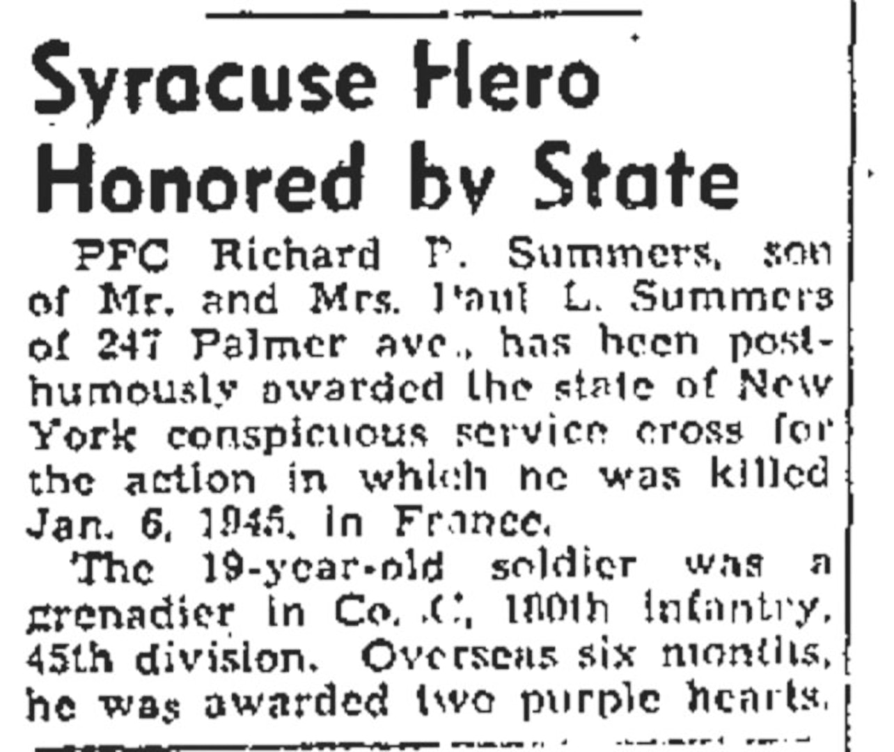 In early 1945, Summers was assigned to Company C, 1st Battalion, 180th Infantry Regiment, 45th Infantry Division. On Jan. 6, Summers was reportedly killed in action while his unit was on patrol near Wildenguth, France. The Germans never reported Summers as a prisoner of war, and his remains were not immediately recovered.