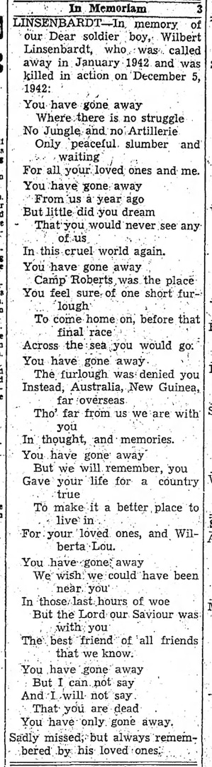 In the winter of 1942, Linsenbardt was assigned to Company A, 128th Infantry Regiment, 32nd Infantry Division. He was reportedly killed in action on Dec. 5, near Buna in Papua New Guinea after his unit encountered intense enemy fire. His remains were not recovered after the war, and he was declared non-recoverable in 1951.