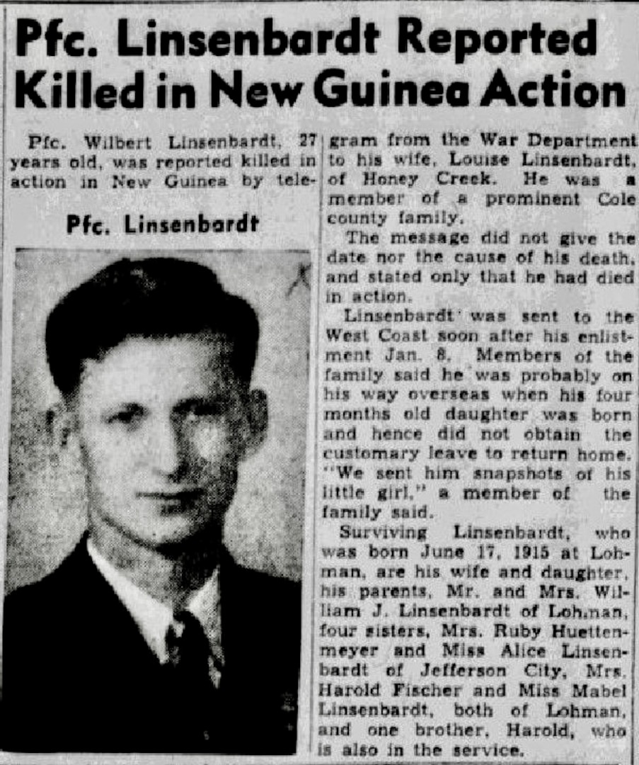 The Defense POW/MIA Accounting Agency announced today that U.S. Army Pfc. Wilbert G. Linsenbardt, 27, of Lohman, Missouri, killed during World War II, was accounted for on April 30, 2025.