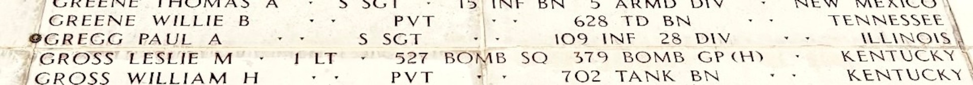 In late 1944, Gregg was assigned to Company H, 2d Battalion, 109th Infantry Regiment, 28th Infantry Division. On Dec. 18, Gregg was reported missing in action following combat near Fouhren, Luxembourg, during the Battle of the Bulge. His remains were not accounted for after the war and on Dec. 19, 1945, Army officials issued a presumptive finding of death.