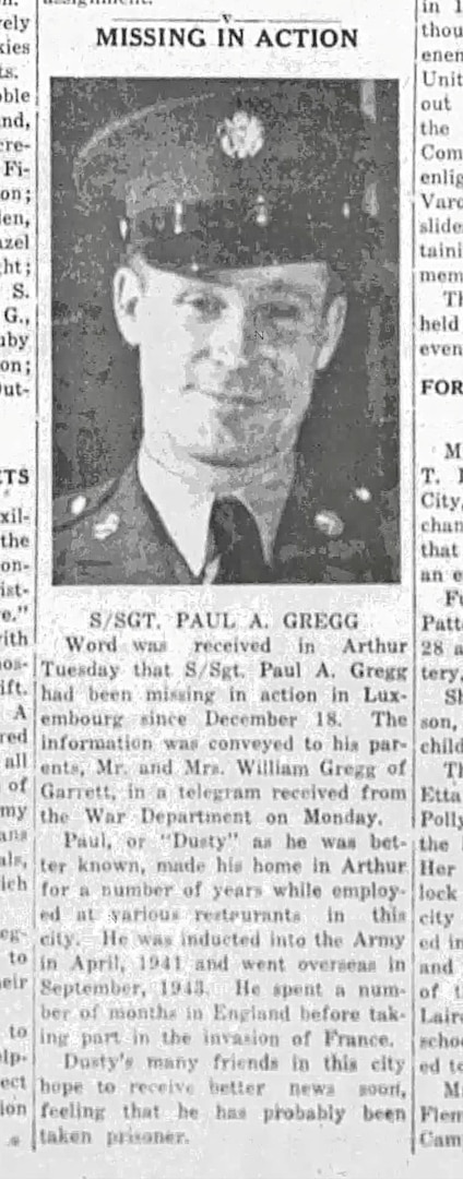 The Defense POW/MIA Accounting Agency announced today that U.S. Army Staff Sgt. Paul A. Gregg, 29, of Arthur, Illinois, killed during World War II, was accounted for May 29, 2025.